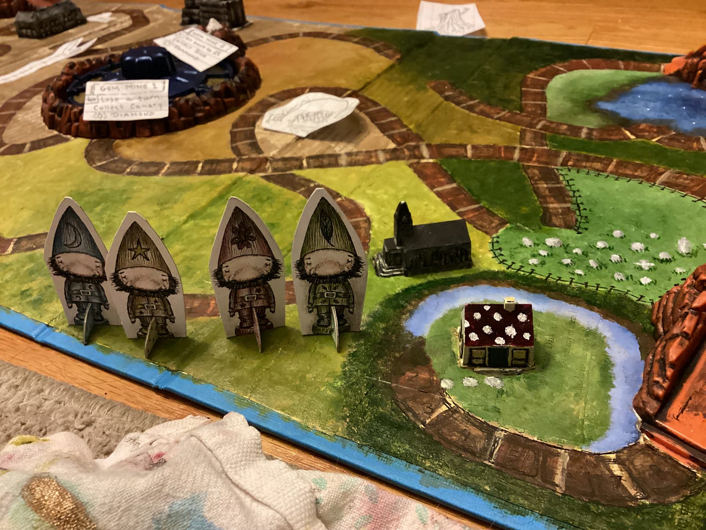 i’ve been trying to finish a game i’m making for Hodge. it’s shaping up, but also going slow for trying to figure it all out as i go. it’s created from a Life board we were going to get rid of and based on the play style of our favorite game Uncle Wiggly. i’ve already written the rules and 79 cards out and now just have to finish painting and assembling all of it. oh yes, and testing to see if it’s even fun and playable. i’ve always wanted to make one and since Hodge wants me to make another based on his new book characters i figured it would be good to try out an old idea first on something already on hand. this one is based on the Nose Gnomes from our Mushroom Hoarder story sculptures i made with him years ago.
